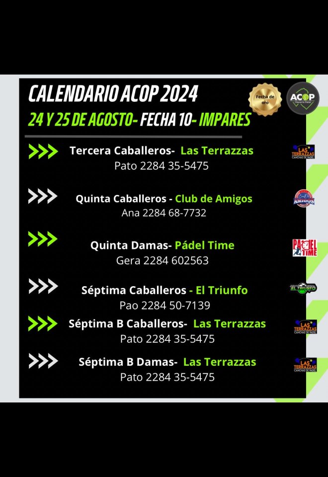»» Evento: ACOP 10 MA FECHA DE ORO IMPARES »» Localidad: Olavarría »» Fechas: 23/08/2024 al 25/08/2024