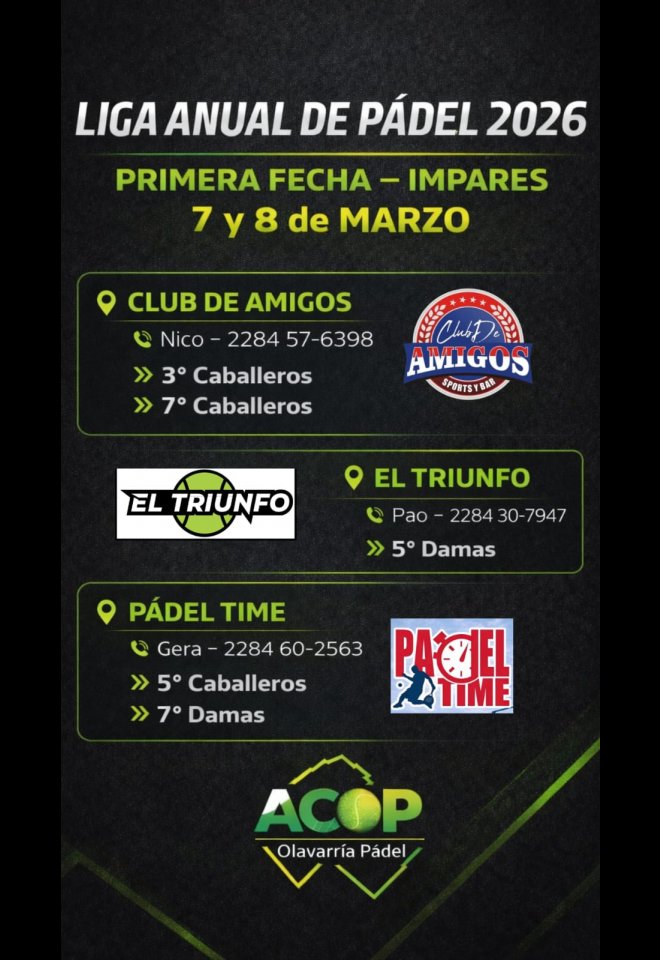»» Evento: LIGA ACOP 2026 FECHA 1 IMPARES »» Localidad: Olavarría »» Fechas: 06/03/2026 al 08/03/2026