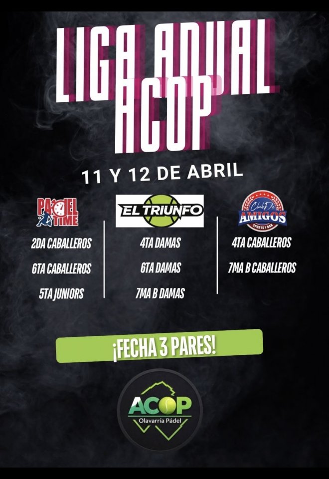 »» Evento: LIGA ACOP 2026 FECHA 3 PARES »» Localidad: Olavarría »» Fechas: 10/04/2026 al 12/04/2026
